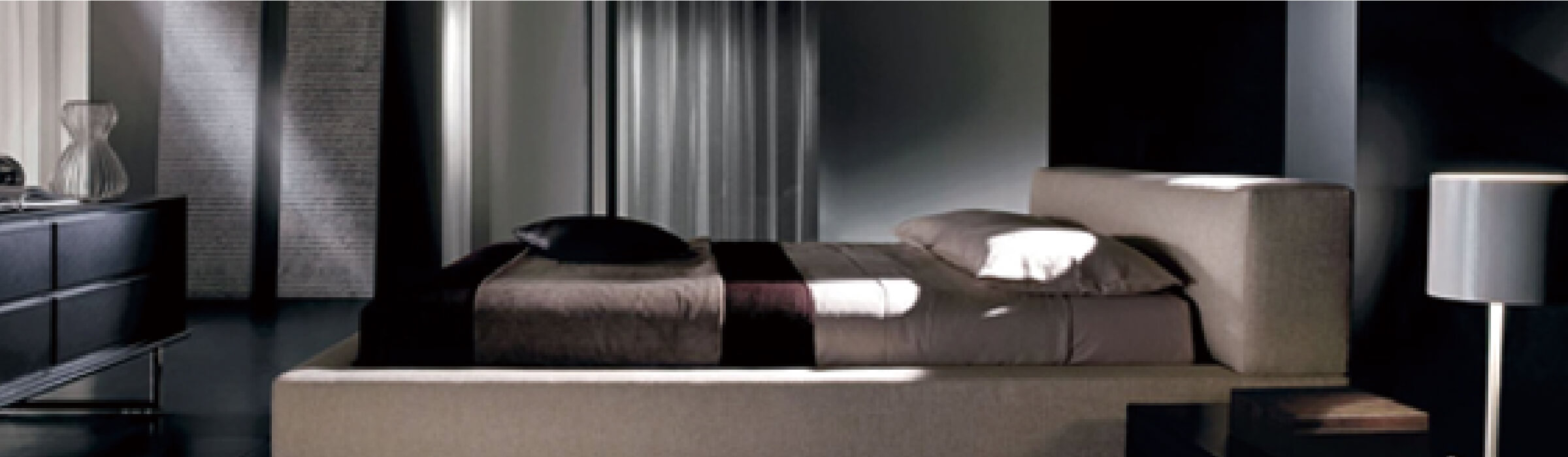 社内のデザイングループ、スタジオCCが2010年に製作したベッド。さまざまな素材、テクスチャー、サイズにより、最もクラシックなものから最も独創的なものまで、無限のカスタマイズの可能性が広がります。ヘッドボードの幾何学的なフレームは、スムースな布張りタイプとキルティングタイプがあります。張地はファブリック、レザー、ナチュラルレザーからお選びいただけます。ブラッドベッドのフレームはアメリカンウォールナット無垢材で、マットレスベースは化粧合板です。本質的でありながら快適なエレガンスを備えたスタイルは、くつろぎの場として理想的です。スリーピングエリアのレイアウトを完成させるために、同じシリーズのチェストやベッドサイドテーブルと組み合わせることもできます。